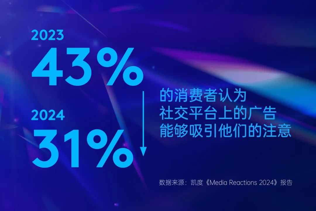 研究发现,全球仅有三分之一的人表示社交媒体平台上的广告能吸引他们的注意,较去年的43%显著下降。这不单单是年轻观众的注意力缺失问题,而是各代人都对社媒广告的现状感到失望。凯度预计,2025年广告主将采取更多新鲜创意形式来重新吸引观众,例如,使用实验性的拍摄和剪辑手法等。